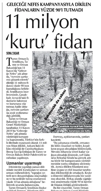 Cumhuriyet Gazetesi muhabiri Sena Yaşar imzalı "Milyonlarca fidan tutmadı" başlıklı "haber" bugün Cumhuriyet gazetesinin birinci sayfasından anons edildi.