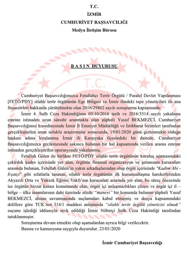 "Örgüt içerisinde 'kadim abi - irşatçı' gibi sıfatlarla tanınan, silahlı terör örgütünün ilk kurumsallaşma hareketlerinden Akyazılı Orta ve Yüksek Eğitim Vakfı'nın kurucuları arasında yer alan, bu süreç öncesinde ise örgütün bizzat kasası konumunda olan, örgüt içi anlaşmazlıkları çözen ve örgüt içi il - bölge - ülke imamlarının dahi üzerinde sözde 'manevi' bir konumda bulunan şüpheli Yusuf Bekmezci, alınan savunmasında suçlamaları kabul etmemiş ve dosya kapsamındaki delillere göre Türk Ceza Kanunu'nun 314/1 maddesi kapsamında 'silahlı terör örgütü yöneticisi olmak' suçunu işlediği iddiasıyla sevk edildiği İzmir Nöbetçi Sulh Ceza Hakimliği tarafından tutuklanmıştır."