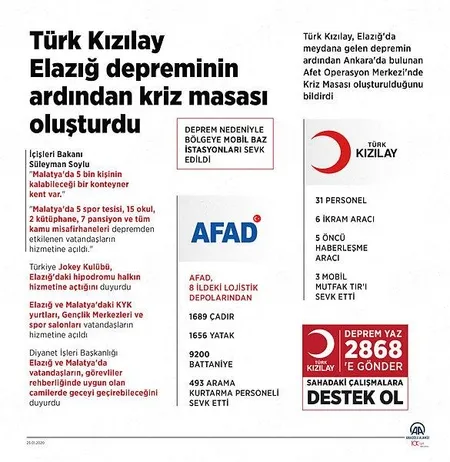 "Bölgede olası ihtiyaçlar için hastanelere ilave kan tedarik planlaması yapılmıştır. AFAD ve Valilikten yapılacak uyarıları dinleyelim, Elazığ dışından telekom ve GSM şebekelerini arayarak meşgul etmeyelim, vatandaşlarımız kısa mesaj ve interneti kullansın. Erzurum, Muş, Adana, Elazığ, Ankara'dan afet öncü ekiplerimiz ve komşu il ve ilçe Kızılay gönüllülerimiz bölgeye intikal halindeler. Bölgeye ulaşan ilk ekiplerimiz hasar ve yıkım bilgisi geçiyorlar. Bölgedeki vatandaşlarımızın olumsuz şartlardan korunması için ihtiyaç duyulan malzemeleri bölgeye sevk ediyoruz."