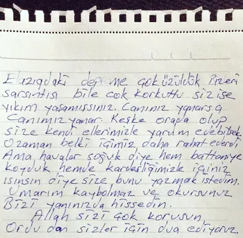 ''Elazığ'daki depreme çok üzüldük. Bizleri sarsıntısı bile çok korkuttu, siz ise yıkım yaşamışsınız. Canınız yanarsa canımız yanar. Keşke orada olup size kendi ellerimizle yardım edebilsek. O zaman içimiz daha rahat ederdi. Ama havalar soğuk diye hem battaniye koyduk hem de kardeşliğimizle içiniz ısınsın diye size bunu yazmak istedim. Umarım kaybolmaz ve okursunuz. Bizi yanınızda hissedin. Allah sizi çok korusun. Ordu'dan sizler için dua ediyoruz.''