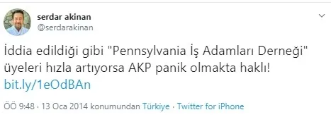 13 Ocak 2014: "İddia edildiği gibi "Pennsylvania İş Adamları Derneği" üyeleri hızla artıyorsa AKP panik olmakta haklı!