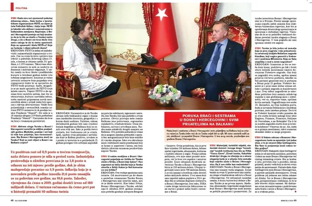 Başkan Recep Tayyip Erdoğan, Bosna Hersek'te yayımlanan Stav Dergisi'ne verdiği mülakatta gündeme ilişkin değerlendirmelerde bulundu, soruları yanıtladı. Erdoğan, "Türkiye'nin Balkanlar'da istikrar ve kalkınmanın temini, barışın pekiştirilmesi dışında hiçbir özel gündemi yoktur" dedi. Başkan Erdoğan, "Türkiye'nin Bosna Hersek'teki doğrudan yatırımlarının toplamı 250 milyon dolara yaklaşmıştır. 700 milyon doları bulan toplam ticaretimizde kısa vadede hedefimiz 1 milyar dolardır" açıklamasında bulundu. Erdoğan, yeni parti tartışmalarına yönelik ise "Son 17 yılda çok büyük medya kampanyalarıyla kurulan kimi oluşumlar, daha ilk seçimde millet tarafından sandığa gömülmüştür. AK Parti olarak biz başkasına değil, kendimize bakıyor, kendi gündemimize odaklanıyoruz." açıklamasını yaptı.