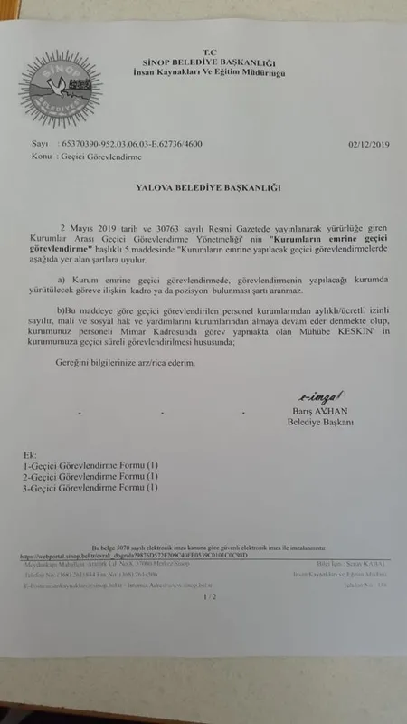O dönemde 6 aylık hamile olan Mühübe Keskin, Yalova'dan 666 kilometre (7 saat 31 dakika) uzakta olan CHP'li Sinop Belediyesi'nde geçici olarak görevlendirildi. Keskin, Bursa 2. İdare Mahkemesi'nin 10 Ocak tarihli kararıyla yeniden işine geri döndü.