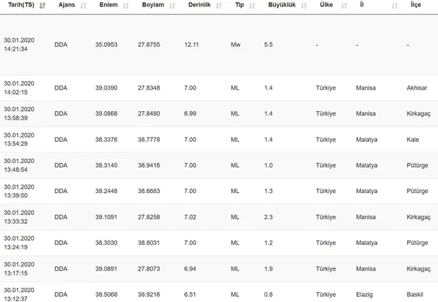 AFAD'ın resmi internet adresinde yer alan bilgiye göre, son depremler listesi şu şekilde;