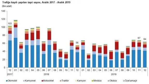 Aralık ayında trafiğe kaydı yapılan taşıt sayısı bir önceki aya göre motosiklette %24,1, otomobilde %5, kamyonda %4, kamyonette %3,3 azalırken, özel amaçlı taşıtlarda %43,6, otobüste %38,7, minibüste %37,8 ve traktörde %24,1 arttı.