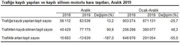 Ocak-Aralık döneminde bir önceki yılın aynı dönemine göre trafiğe kaydı yapılan taşıt sayısı %25,7 azalarak 671 bin 131 adet, trafikten kaydı silinen taşıt sayısı %48,3 artarak 380 bin 77 adet oldu. Böylece 2019 yılı Ocak-Aralık döneminde trafiğe kayıtlı taşıt sayısında 291 bin 54 adet artış gerçekleşti.