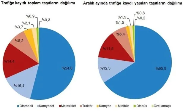 Aralık ayı sonu itibarıyla trafiğe kayıtlı taşıtların %54'ünü otomobil, %16,4'ünü kamyonet, %14,4'ünü motosiklet, %8,2'sini traktör, %3,7'sini kamyon, %2,1'ini minibüs, %0,9'unu otobüs ve %0,3'ünü özel amaçlı taşıtlar oluşturdu. ARALIK AYINDA 1 MİLYON 22 BİN 892 ADET TAŞITIN DEVRİ YAPILDI