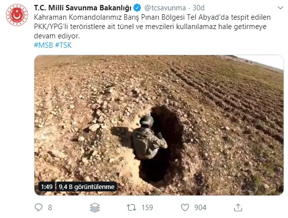 Paylaşımda, "Kahraman Komandolarımız Barış Pınarı Bölgesi Tel Abyad'da tespit edilen PKK/YPG'li teröristlere ait tünel ve mevzileri kullanılamaz hale getirmeye devam ediyor." ifadelerine yer verildi.