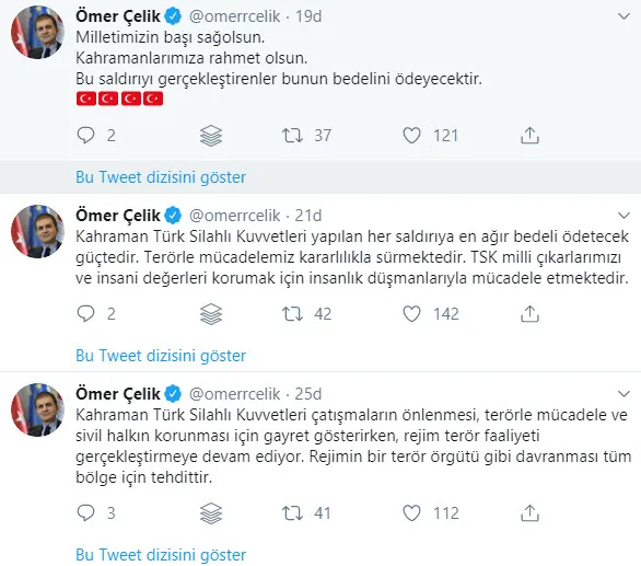"Suriye rejimi, kahraman askerlerimizin yerleri önceden koordine edilmesine rağmen bir saldırı gerçekleştirdi. İdlib mutabakatı rejim tarafından bir kere daha ihlal edildi. Rejim bunun karşılığını daha sert şekilde görecektir. Kahraman Türk Silahlı Kuvvetleri çatışmaların önlenmesi, terörle mücadele ve sivil halkın korunması için gayret gösterirken, rejim terör faaliyeti gerçekleştirmeye devam ediyor. Rejimin bir terör örgütü gibi davranması tüm bölge için tehdittir. Kahraman Türk Silahlı Kuvvetleri yapılan her saldırıya en ağır bedeli ödetecek güçtedir. Terörle mücadelemiz kararlılıkla sürmektedir. TSK milli çıkarlarımızı ve insani değerleri korumak için insanlık düşmanlarıyla mücadele etmektedir. Milletimizin başı sağ olsun. Kahramanlarımıza rahmet olsun. Bu saldırıyı gerçekleştirenler bunun bedelini ödeyecektir."