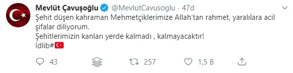 Çavuşoğlu, Twitter hesabından yaptığı paylaşımda "Şehit düşen kahraman Mehmetçiklerimize Allah'tan rahmet, yaralılara acil şifalar diliyorum. Şehitlerimizin kanları yerde kalmadı, kalmayacaktır!" ifadelerini kullandı.