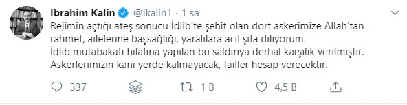 Cumhurbaşkanlığı Sözcüsü Kalın, "Rejimin açtığı ateş sonucu İdlib'te şehit olan dört askerimize Allah'tan rahmet, ailelerine başsağlığı, yaralılara acil şifa diliyorum. İdlib mutabakatı hilafına yapılan bu saldırıya derhal karşılık verilmiştir. Askerlerimizin kanı yerde kalmayacak, failler hesap verecektir." dedi.