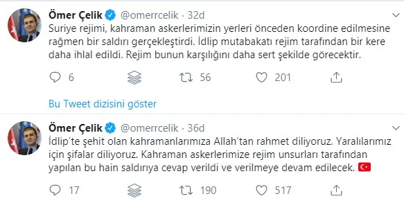AK Parti Sözcüsü Çelik, sosyal paylaşım sitesi Twitter'daki hesabından İdlib'de 6 askerin şehit olduğu, 9 askerin ise yaralandığı, Suriye rejiminin saldırısına ilişkin açıklamalarda bulundu. Çelik, şehit askerlere Allah'tan rahmet, yaralılara da şifa dileyerek, saldırıya cevap verildiğini ve verilmeye devam edildiğini belirtti.