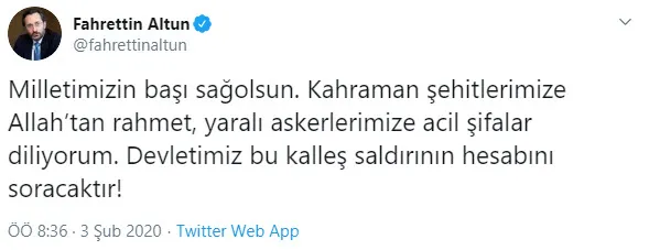 Altun "Milletimizin başı sağolsun. Kahraman şehitlerimize Allah'tan rahmet, yaralı askerlerimize acil şifalar diliyorum. Devletimiz bu kalleş saldırının hesabını soracaktır!" mesajını paylaştı.