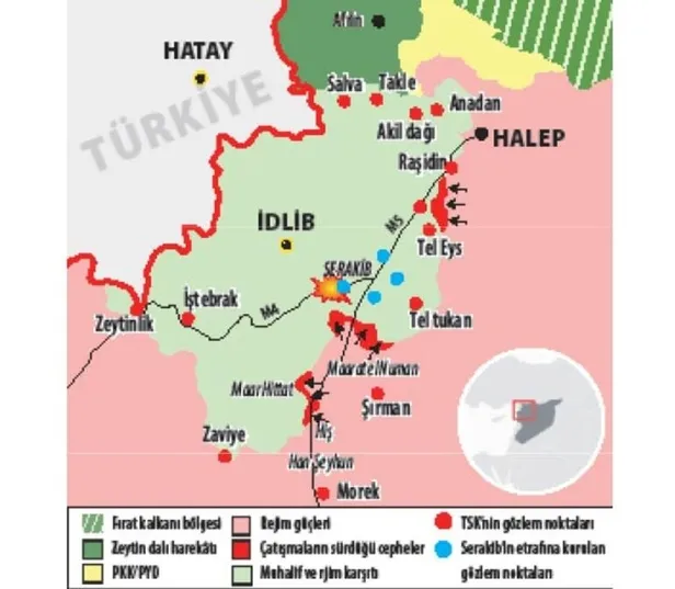 Esad rejim ordusunun İdlib'e yönelik bütün cephelerden saldırıya geçtiği bildirildi. Bölgede, rejim güçleri ile muhalif unsurlar arasındaki çatışmalar geniş alanlara yayıldı. Rejim güçleri İdlib'e yönelik, güney batı Halep, M5 karayolu üzerinden Serakib, batısında yer alan Sarmin, güneyinde Nayrab, M5 karayolundan Ariha, güneyde Kafranbel ve Cisr el Şugur bölgelerindeki muhalif cephelere ilerleyişini sürdürdü. TSK ise rejim ordusunun ilerlediği cephe hatları da dahil, takviye kuvvetlerin birçoğunu İdlib ve Serakib'te konuşlandırarak, rejimiin girmesini engellemeye çalışıyor. TSK, rejim kuvvetlerinin Lazkiye-Halep otoyolu (M4) ve Halep-Şam otoyolu (M5) boyunca yer alan kavşak noktası Serakib'e yönelik, baskısını engellemek için hazırlık yapıyor.