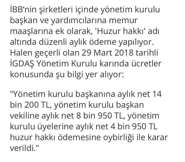 'Huzur hakkı' adı altında İstanbul Büyükşehir Belediyesi iştiraklerinde yönetim kurulu başkanlarına 15 bin TL, yönetim kurulu başkan vekillerine 11 bin TL ile yönetim kurulu üyelerine 5 TL, genel sekreter yardımcılarına 12 bin TL, daire başkanlarına 7 bin TL ve danışmanlarına 10 bin TL düzenli aylık ödeme yapıldığı ifade ediliyor.