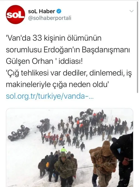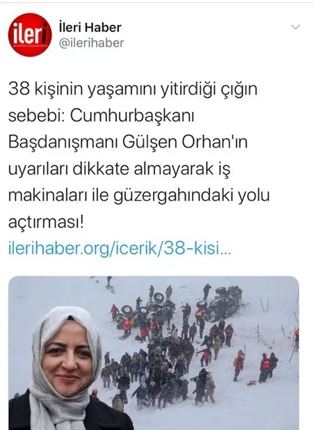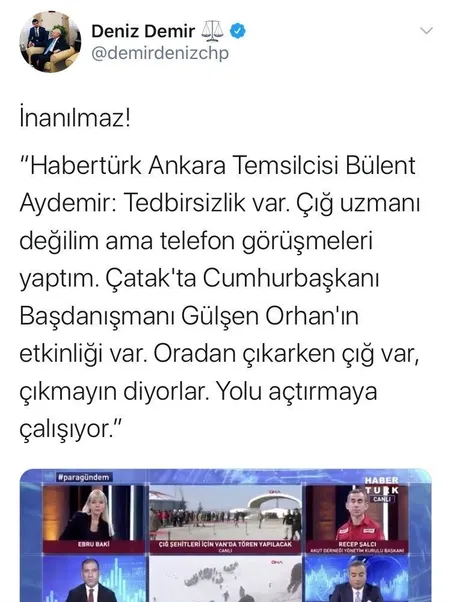 Dün Van'da meydana gelen ikinci çığ faciasında Başkan Erdoğan'ın Başdanışmanı Gülşen Orhan'ın da çığ altında kaldığı ve yaralı olarak kurtarıldığı bildirildi. Onlarca insanın hayatını yitirdiği afeti fırsat bilen CHP ve yandaşı medya organları siyasi prim peşine düşerek "Başdanışman tedbirsizlik yapıp iş makinaları ile yola çıktı" yalanını ortaya attı.