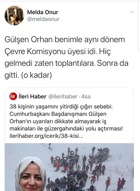 İşin aslı, Gülşen Orhan'ın açıklamalarıyla ortaya çıktı. Orhan, ilk çığda kurtarma çalışmaları hakkında bilgi almak için felaket bölgesine gittiğini belirterek, "Cenazelerimizi götürürken onlardan ayrılıp çığ felaketinin yaşandığı yere gelmemize 'toplantı için iş makinalarını yanına almış yolları açtırmış' demek yalancılıktır, acı bilmezliktir" dedi.