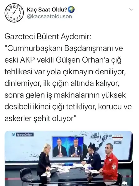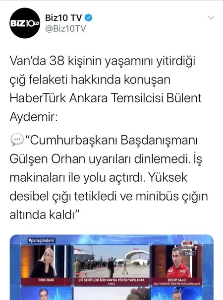 Habertürk Ankara Temsilcisi Bülent Aydemir, Cumhurbaşkanı Başdanışmanı ve eski AK Parti Van Milletvekili Gülşen Orhan için ''Bahçesaray ilçesine gitmek için kendine yol açtırırken çığın olduğu" şeklinde bir yalan ortaya attı. Aydemir'in asılsız haberini fırsat bilen birçok medya organı, durumu fırsat bilerek doğruluğunu araştırma zahmetine girmeden yalana çanak tuttu.