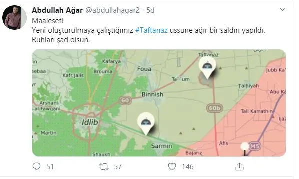 Güvenlik Uzmanı Abdullah Ağar twitter hesabından Suriye'de Türkiye'nin inşa etmek istediği Taftanaz Üssü'ne ağır bir saldırı gerçekleştirdildiğini ve şehitlerimizin olduğunu paylaştı... Milli Savunma Bakanlığı'nın açıklamasında İdlib'de Suriye rejimi güçlerinin açtığı topçu ateşi sonucu 5 askerin şehit olduğu, 5 askerin ise yaralandığı açıklandı.