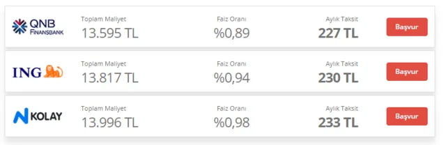 10.000 TL 36 ay vade için en uygun ihtiyaç kredisi faiz oranları: