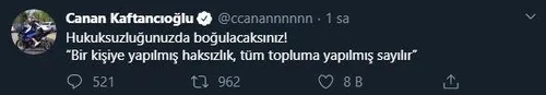 PKK terör örgütünün siyasi uzantısı HDP ile ortaklığını her defasında dile getirmekten çekinmeyen CHP İstanbul İl Başkanı Canan Kaftancıoğlu da 'Hukusuzluğunuzda boğulacaksınız' sözleriyle sosyal medyadan paylaşımda bulunarak hedef gösterdi.