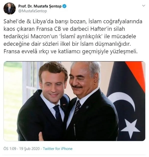 Şentop, paylaşımında Fransa Cumhurbaşkanı Emmanuel Macron'un darbeci General Halife Hafter ile sarıldıkları fotoğrafa da yer verdi.