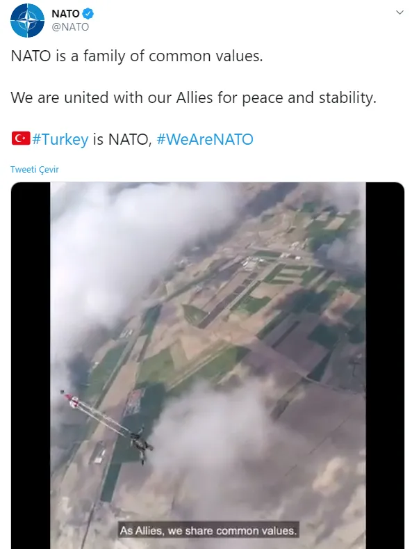 NATO, resmi Twitter hesabından Türkiye'nin ittifaka sağladığı katkı hakkında "NATO ortak değerlerden oluşan bir ailedir. Barış ve istikrar için müttefiklerimizle birlikteyiz. Türkiye NATO'dur. Biz NATO'yuz." mesajıyla bir klip paylaştı.
