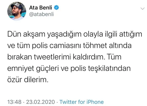 Paylaşımlarından dolayı polislerden özür dileyen Ata Benli, söz konusu paylaşımları bir süre sonra sildi. Bu olayın ardından sosyal medya hesabını da kapattı.