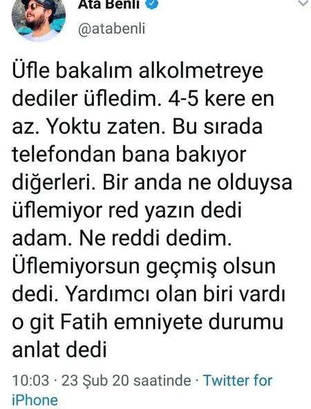 Ata Benli'nin alkollü olduğunu beyan ettiğini ancak alkolmetre cihazına üflemekten imtina ettiği aktarılan açıklamada, şunlar kaydedildi:
