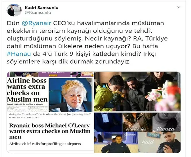 Ryanair CEO’su Michael O’Leary’nin Müslüman erkekler hakkındaki sözlerine bir tepki de İGA CEO’su Kadri Samsunlu’dan geldi. Samsunlu, O'Leary'nin sosyal medyada büyük tepki çeken açıklamalarıyla ilgili "Bu hafta #Hanau da 4’ü Türk 9 kişiyi katleden kimdi? Irkçı söylemlere karşı dik durmak zorundayız” dedi.