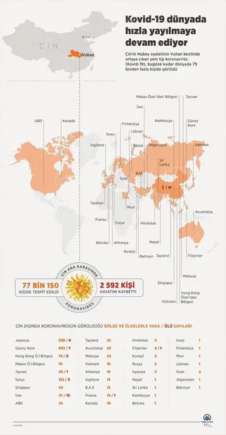 Çin'de toplam can kaybı, 2'si Hong Kong Özel İdari Bölgesi'nden olmak üzere 2 bin 619'a çıkarken, kesinleşen Covid-19 vakası da 77 bin 150'ye ulaştı.