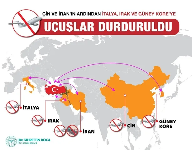 Sağlık Bakanı Fahrettin Koca, koronavirüs (Kovid-19) karşı alınan tedbirler kapsamında, bu gece yarısından itibaren geçerli olmak üzere, Türkiye-İtalya, Türkiye-Güney Kore, Türkiye-Irak arasında gidiş-geliş tüm yolcu uçuşlarının tedbiren durdurulduğunu açıkladı.