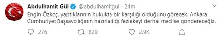 Gül, "Engin Özkoç, yaptıklarının hukukta bir karşılığı olduğunu görecek. Ankara Cumhuriyet Başsavcılığının hazırladığı fezlekeyi derhal meclise göndereceğiz." dedi.