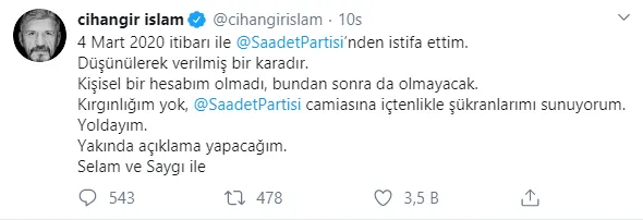 Saadet Partisi'nin İstanbul Milletvekili Cihangir İslam, resmi sosyal medya hesabı Twitter'dan yaptığı açıklamada partisinden istifa ettiğini duyurdu. İslam açıklamasında "4 Mart 2020 itibarıyla Saadet Partisinden istifa ettim. Düşünülerek verilmiş bir karardır. Kişisel bir hesabım olmadı, bundan sonra da olmayacak. Kırgınlığım yok. Saadet Partisi camiasına içtenlikle şükranlarımı sunuyorum." ifadesini kullandı.