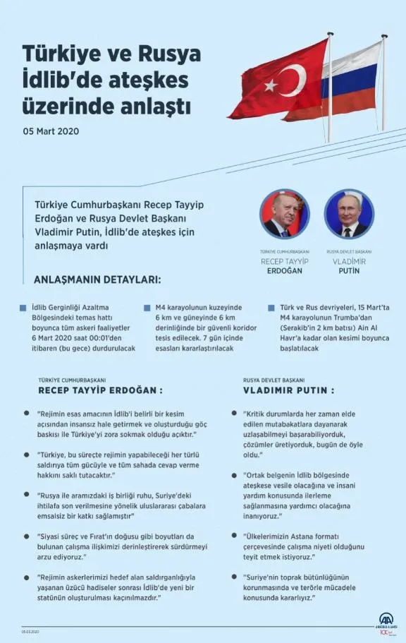 Türkiye ile Rusya, İdlib gerginliği azaltma bölgesindeki temas hattı boyunca tüm askeri faaliyetlerin 6 Mart 2020'de saat 00:01'den itibaren durdurulmasında anlaştı. İki ülke, ayrıca M4 karayolunun kuzeyinde 6 kilometre ve güneyinde 6 kilometre derinliğinde bir güvenli koridor tesis edilmesinde ve M4 karayolunun bir bölümünde ortak devriyeler konusunda uzlaştı.