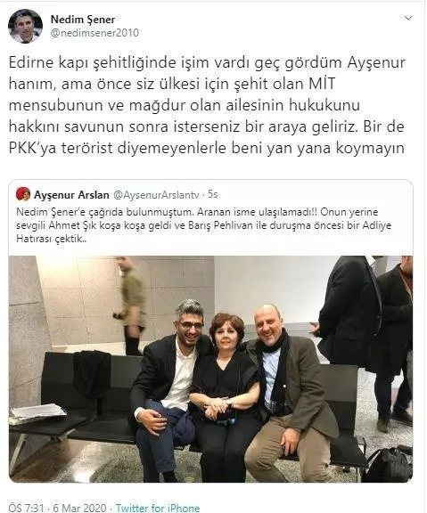 Libya’da şehit olan MİT mensubunun cenaze fotoğraflarını ve görüntülerini hukuk dışı bir şekilde haberleştiren Oda TV’nin haber müdürü Barış Terkoğlu ve muhabiri Hülya Kılınç ile Genel Yayın Yönetmeni Barış Pehlivan mahkemece tutulandı. Halk TV’ci Ayşenur Arslan sosyal medya hesabından adliyede sorguda olan Barış Pehlivan’a destek için Nedim Şener’e adliyeye gelmesi çağrısında bulundu. Arslan’ın yanında HDP’li Ahmet Şık da bulunuyordu. Nedim Şener bu davete, “MİT mensubunun ve mağdur olan ailesinin hukukunu hakkını savunun sonra isterseniz bir araya geliriz. Bir de PKK’ya terörist diyemeyenlerle beni yan yana koymayın!” diyerek cevap verdi.