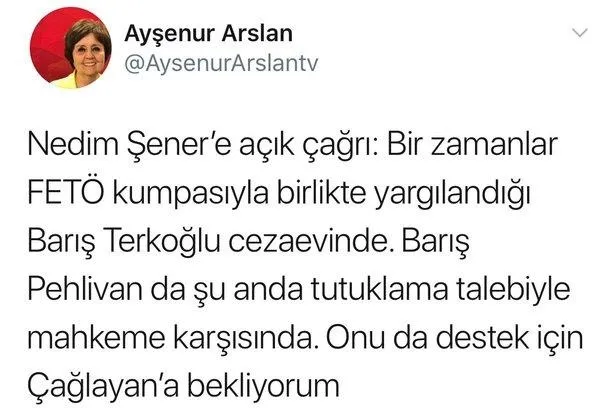 Halk TV ekranlarında görülen Ayşenur Arslan Barış Pehlivan'a destek için geldiği İstanbul Adliyesi'nde sosyal medya hesabından Hürriyet yazarı Nedim Şener'e çağrıda bulundu. Twitter hesabından "Bir zamanlar FETÖ kumpasıyla birlikte yargılandığı Barış Terkoğlu cezaevinde. Barış Pehlivan da şu anda tutuklama talebiyle mahkeme karşısında. Onu da destek için Çağlayan'a bekliyorum" dedi.
