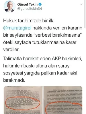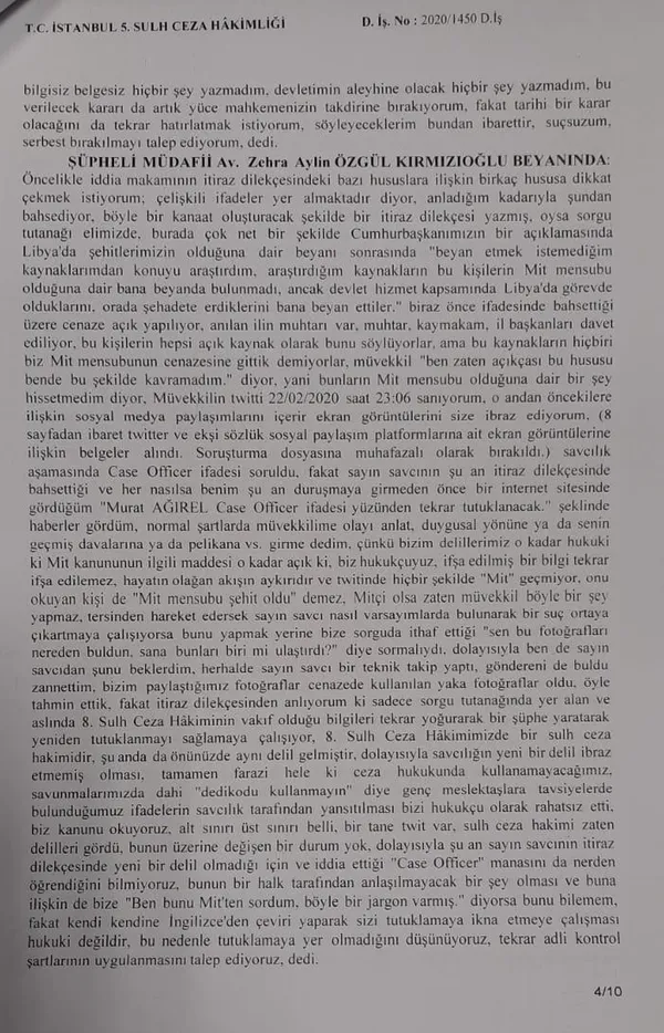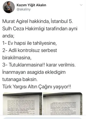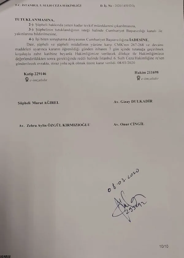 İstanbul 5. Sulh Ceza Mahkemesi'nin Murat Ağırel hakkında tutuklamaya yönelik karar metni 10 sayfadan oluşuyor. Mahkemenin 10 sayfalık kararında; Murat Ağırel'in serbest bırakılmasına yönelik hiçbir kelime yer almıyor.