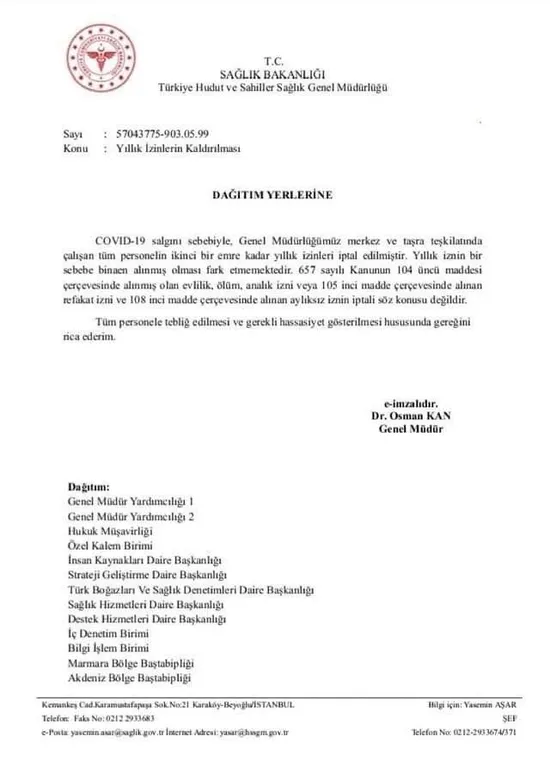 "COVID-19 salgını sebebiyle, Genel Müdürlüğümüz merkez ve taşra teşkilatında çalışan tüm personelin ikinci bir emre kadar yıllık izinleri iptal edilmiştir. Yıllık iznin bir sebebe binaen alınmış olması fark etmemektedir. 657 sayılı Kanunun 104 üncü maddesi çerçevesinde alınmış olan evlilik, ölüm, analık izni veya 105 inci madde çerçevesinde alınan refakat izni ve 108 inci madde çerçevesinde alınan aylıksız iznin iptali söz konusu değildir. Tüm personele tebliğ edilmesi ve gerekli hassasiyet gösterilmesi hususunda gereğini rica ederim."