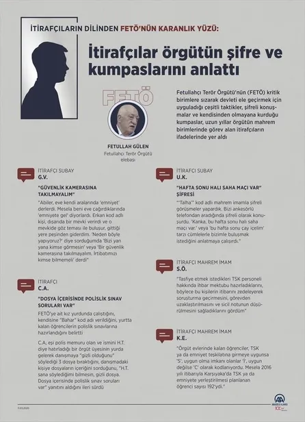 Fetullahçı Terör Örgütü'nün (FETÖ) kritik birimlere sızarak devleti ele geçirmek için uyguladığı çeşitli taktikler, şifreli konuşmalar ve kendisinden olmayana kurduğu kumpaslar, uzun yıllar örgütün mahrem birimlerinde görev alan itirafçıların ifadelerinde yer aldı.