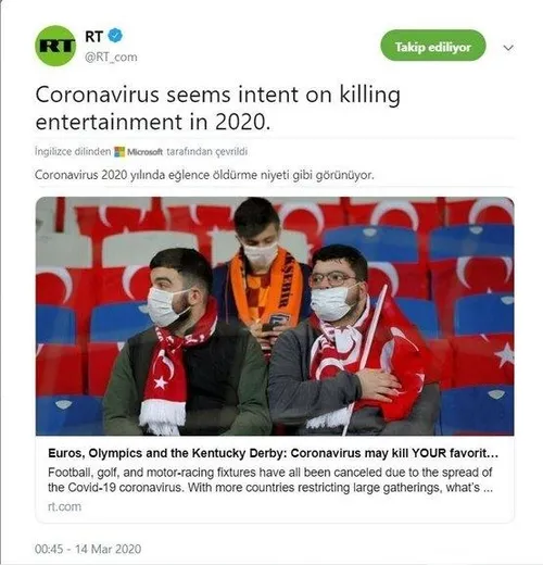 BATI medyası, şimdi de Coronavirüs bahanesiyle ülkemize saldırdı. Yalnızca 5 vakanın görüldüğü Türkiye'de büyük bir virüs salgını varmış algısı yarattı. Kirli operasyona Rus haber kanalı Russia Today (RT) de katıldı. Dünyadaki spor müsabakalarının ertelenmesi haberinde, boynunda Türk bayrağı taşıyan gençleri kullandı. Amerikan haber ajansı AP de Trump'ın Coronavirüs testi yaptıracağı haberinde, ülkemizden bir cami fotoğrafı kullandı. Bu haberlere sosyal medyadan tepki yağdı. Öte yandan ABD Başkanı Trump, test yaptırdığını açıkladı. "Sonuçlar birkaç güne çıkar" dedi.
