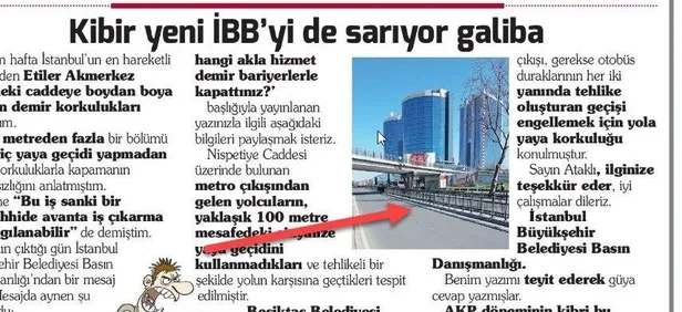 İBB'nin yanıtından memnun kalmayan Ataklı, belediyeyi "kibir sardığını" belirterek "Kendini herkesten üstte görme alışkanlığı ile ya hiç cevap vermeme ya da karşısındakine aptal muamelesi yaparak güya cevap vermiş gibi görünme alışkanlığı kimseyi bir yere götürmez. Yazımda otobüsten veya metrodan çıkan birinin karşıya geçemediğini yazıyorum. Ayrıca o yol Akmerkez yapıldığından yani 35 yıldan beri öyleydi. Muhtemelen okuldan çıkan çocukların veya diğer yayaların karşıdan karşıya geçmek isterken geniş bir alana yayılmaları tehlike saçıyordu. Ama bunun çaresi tüm yolu geçilmez hale getirmek değildir herhalde." ifadelerini kullandı.