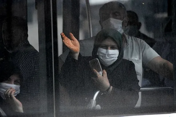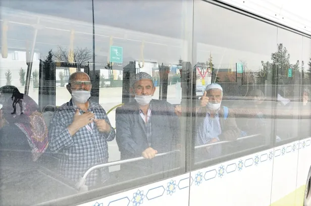 Havaalanından otobüslere bindirilen umreciler, yurtlara taşındı.