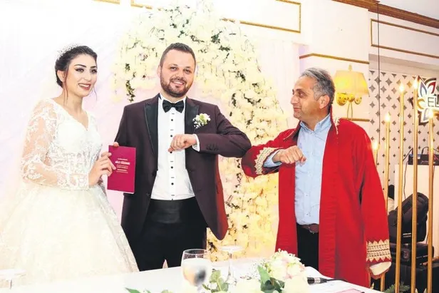 Antalya'da bir düğünde Coronavirüs nedeniyle kimse tokalaşmadı. Nikah memuru ile damat ise tokalaşmak yerine dirseklerini birbirine vurdu.