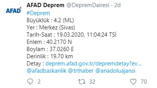 AFAD'dan alınan son dakika bilgisine göre Sivas'ta 4.2 büyüklüğünde deprem meydana geldi. Depremin yaklaşık olarak 20 kilometre derinlikte gerçekleştiği bildirildi.