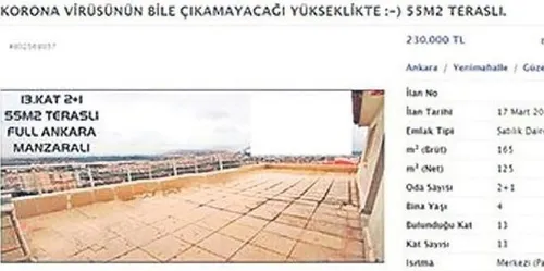 CORONAVIRÜS endişesi gayrimenkul ilanlarına da sıçradı. Kimi ilanlarda 'Coronavirüs geçirmez ev', 'Coronavirüsün çıkamayacağı yükseklik' gibi gerçek dışı tanımlar da yapılıyor.