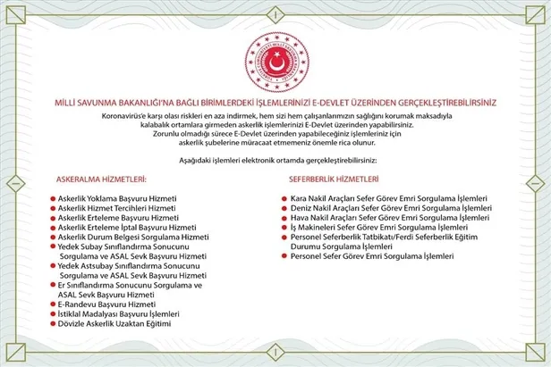 Milli Savunma Bakanlığından yapılan açıklamada "Koronavirüs’e karşı olası riskleri en aza indirmek, hem sizi hem çalışanlarımızın sağlığını korumak maksadıyla kalabalık ortamlara girmeden askerlik işlemlerinizi E-Devlet üzerinden yapabilirsiniz. Zorunlu olmadığı sürece E-Devlet üzerinden yapabileceğiniz işlemleriniz için askerlik şubelerine müracaat etmemeniz önemle rica olunur." ifadelerine yer verildi.