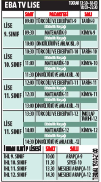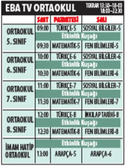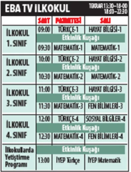 İlkokul 1'inci ve ortaokul 5'inci sınıfların dersi 09.00 ve 09.30'da başlayacak. 2'nci ve 6'ncı sınıflar 10.00 ve 10.30'da; 3'üncü ve 7'nci sınıflar 11.00 ve 11.30'da; 4'üncü ve 8'inci sınıflar 12.00 ve 12.30'da derslerini izleyecek. İlkokullarda yetiştirme programı 13.00'te başlayacak. İmam hatip ortaokulu Arapça dersleri 13.00'te olacak. Lise 9'uncu sınıflar 09.00, 09.30 ve 10.00'da; 10'uncu sınıflar 10.30, 11.00 ve 11.30'da; 11'inci sınıflar 12.00, 12.30 ve 13.00'te; 12'nci sınıflar 13.30, 14.00 ve 14.30'da televizyon karşısına geçecekler.