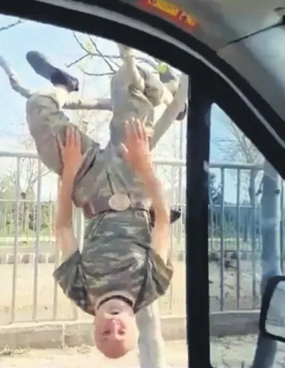 Adana'da askeri kamuflajlı yaşlı bir dede ağaca tırmandı. Baş aşağı asılı halde komando marşı söyleyip virüse meydan okudu.