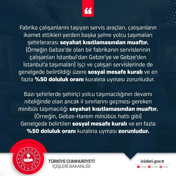 "Fabrika çalışanlarını taşıyan servis araçları, çalışanların ikamet ettikleri yerden başka şehre yolcu taşımaları ile şehir içi yolcu taşımacılığının devamı niteliğinde olan ancak il sınırlarını geçen minibüs taşımacılığı 'şehirler arası seyahat' kısıtlamasından muaftır. (Örneğin, Gebze'de olan bir fabrikanın servislerinin çalışanları İstanbul'dan Gebze'ye ve Gebze'den İstanbul'a taşımaları) İşçi ve çalışan servislerinde de genelgede belirtildiği üzere sosyal mesafe kuralı ve en fazla yüzde 50 doluluk oranı kuralına uyulması zorunludur."